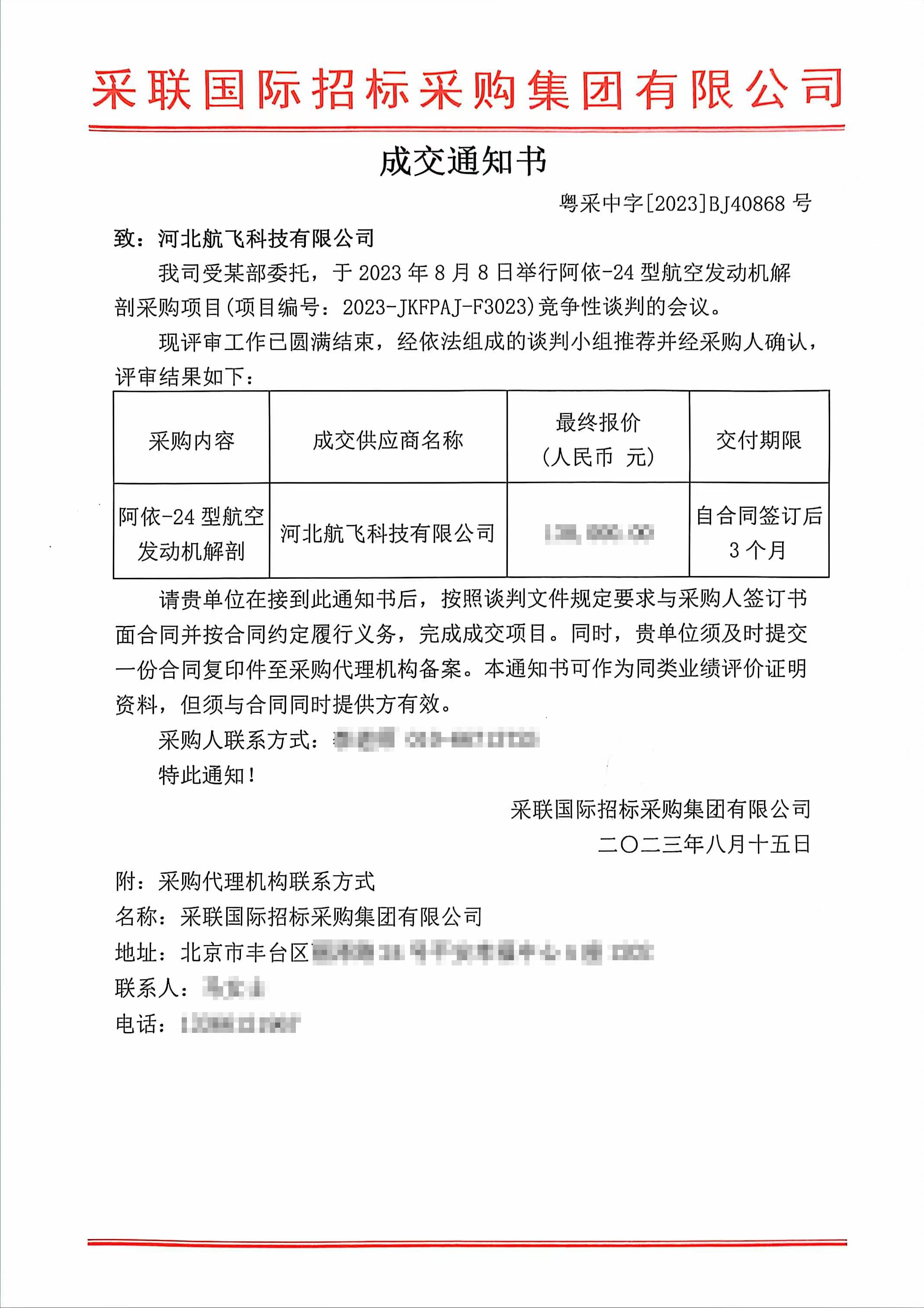 于2023年8月15日,我司獲悉項目中標通知書